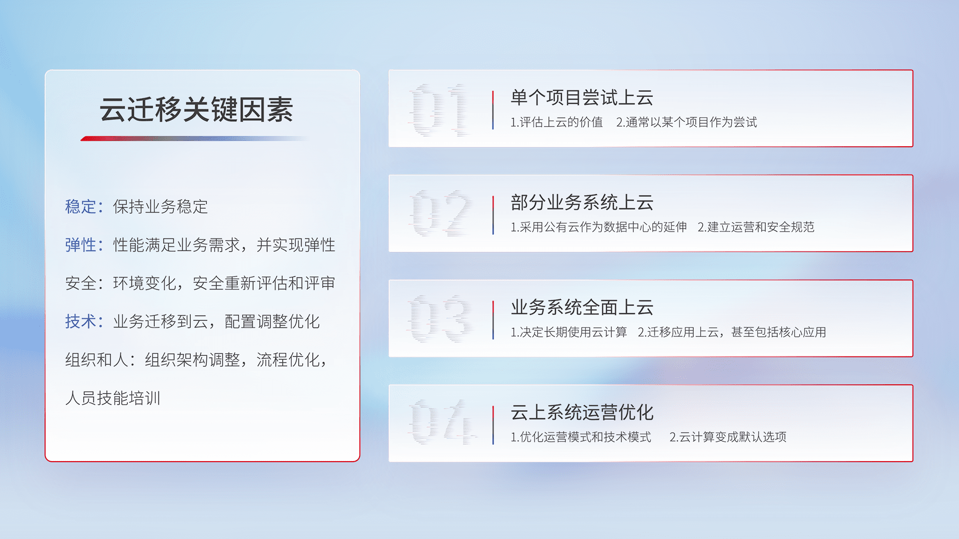 结合实际业务,,,,从规划设计、、、云平台选型、、、、云原生改造、、数据迁移、、、集成交付,,迁移全过程为客户识别最佳上云路径,,做好风险识别管理,,,设计网络架构、、身份权限、、、、安全审计合规、、操作审计、、、日志审计、、、、监控告警策略、、、、多站点容灾设计等,,,对云上基础设施进行整体规划,,,提升IT治理水平,,以满足弹性、、高可用、、高性能的需求。。